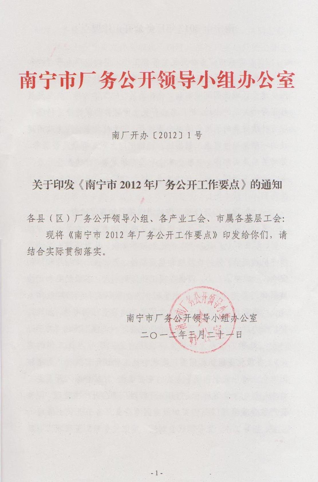 關(guān)于印發(fā)《南寧市2012年廠務(wù)公開工作要點》的通知(南廠開辦[2012]1號)