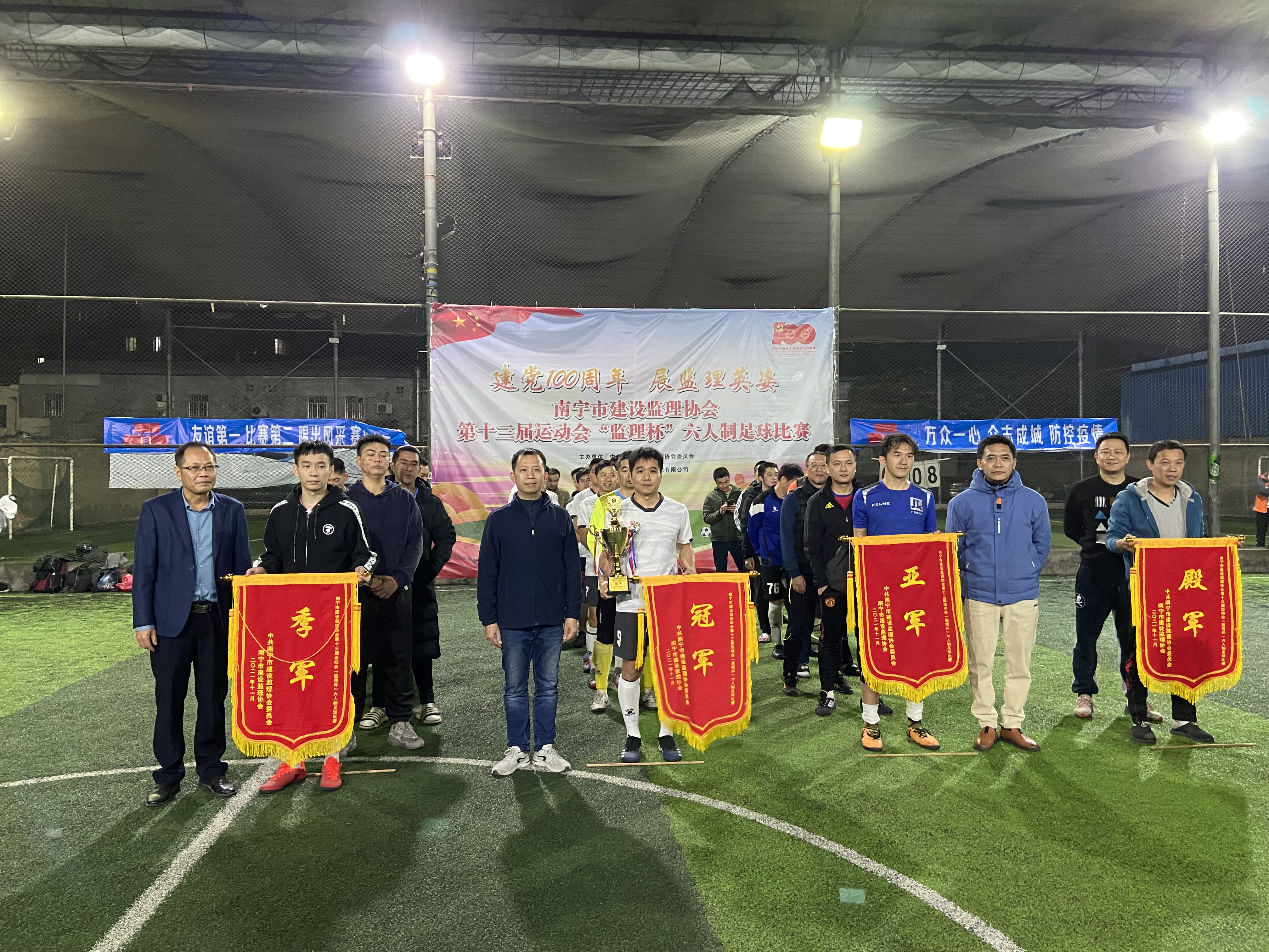為慶祝中國共產(chǎn)黨建黨100周年,中共南寧市建設(shè)監(jiān)理協(xié)會委員會和南寧市建設(shè)監(jiān)理協(xié)會共同舉辦了南寧市建設(shè)監(jiān)理協(xié)會第十三屆運(yùn)動會“監(jiān)理杯”六人制足球比賽,經(jīng)過兩個多月緊張、激烈的比賽,于2021年12月23日23:00完美落幕,南寧品正足球隊(duì)在此次比賽中榮獲季軍。