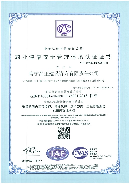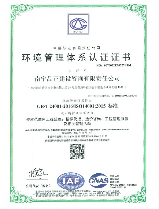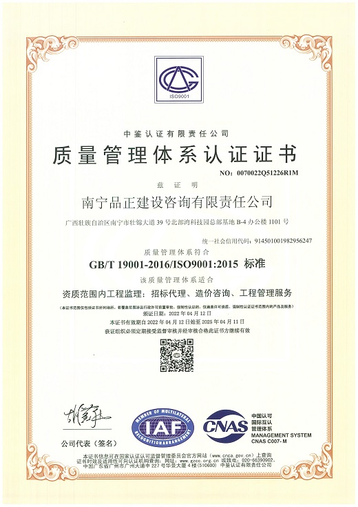 南寧品正于2000年通過ISO9001:2000質(zhì)量體系認證,2009年改版為ISO9001:2008并通過認證;2016年5月同時通過GB/T19001-2008質(zhì)量管理體系、GB/T28001-2001職業(yè)健康安全管理體系認證和GB/T24001-2004環(huán)境管理體系三體系認證。公司長期重視管理體系認證與實際工作的結(jié)合,制定行之有效的檢查及內(nèi)審程序文件,形成了完整的《管理手冊》、《程序文件》、《標(biāo)準(zhǔn)作業(yè)指導(dǎo)書》三個層次的質(zhì)量體系文件。每年定期進行工作質(zhì)量檢查、質(zhì)量體系內(nèi)審和管理評審,確保公司整體質(zhì)量、環(huán)境和職業(yè)健康安全工作的有效性、持續(xù)性,達到規(guī)范化和標(biāo)準(zhǔn)化。