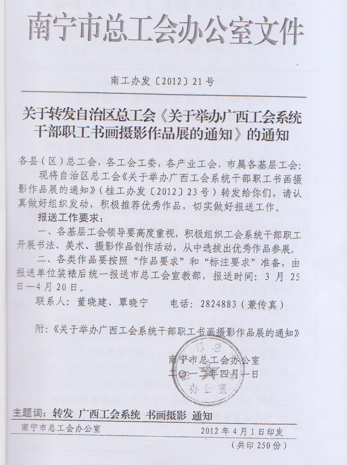 關于轉發(fā)《關于舉辦廣西工會系統(tǒng)干部職工書畫攝影作品展的通知》