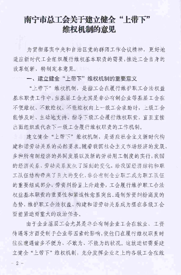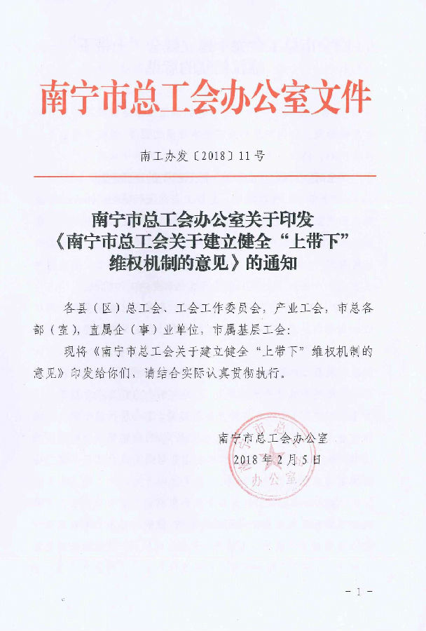 南寧市總工會辦公室關于印發(fā)《南寧市總工會關于建立健全“上帶下”維權機制的意見》的通知