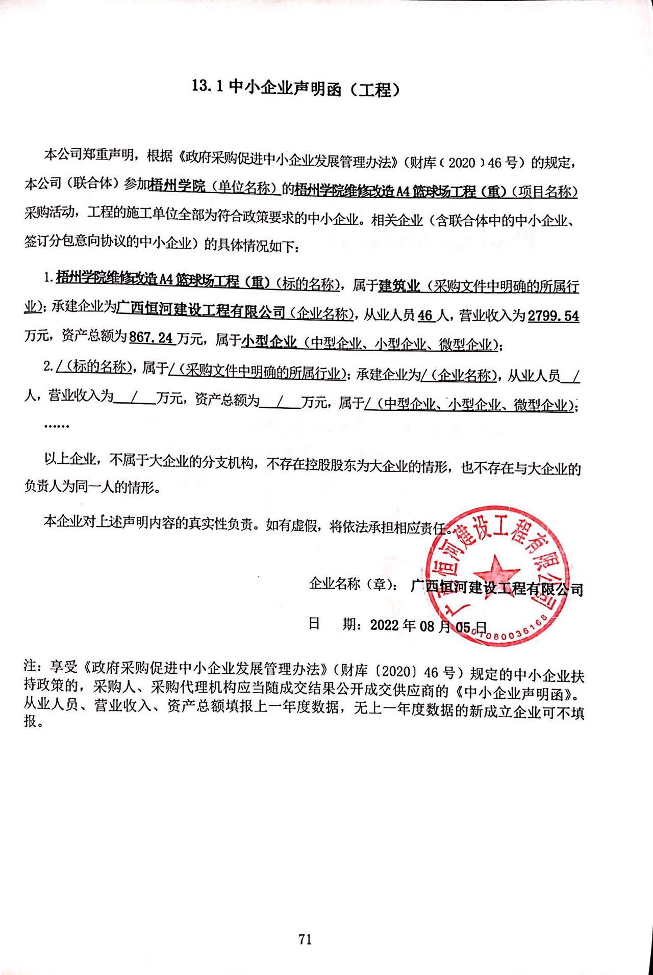 名稱:梧州學院維修改造A4籃球場工程(重) 工程內(nèi)容:梧州學院維修改造A4籃球場工程一項,項目施工地點位于梧州學院內(nèi);實施內(nèi)容包括:維修改造A4籃球場,對周邊地面硬化、綠化工程,拆除暗溝、圍擋以及籃球場涂料等內(nèi)容。具體內(nèi)容詳見采購人發(fā)出的工程量清單及圖紙。 工期(合同履約期):90日歷天 |